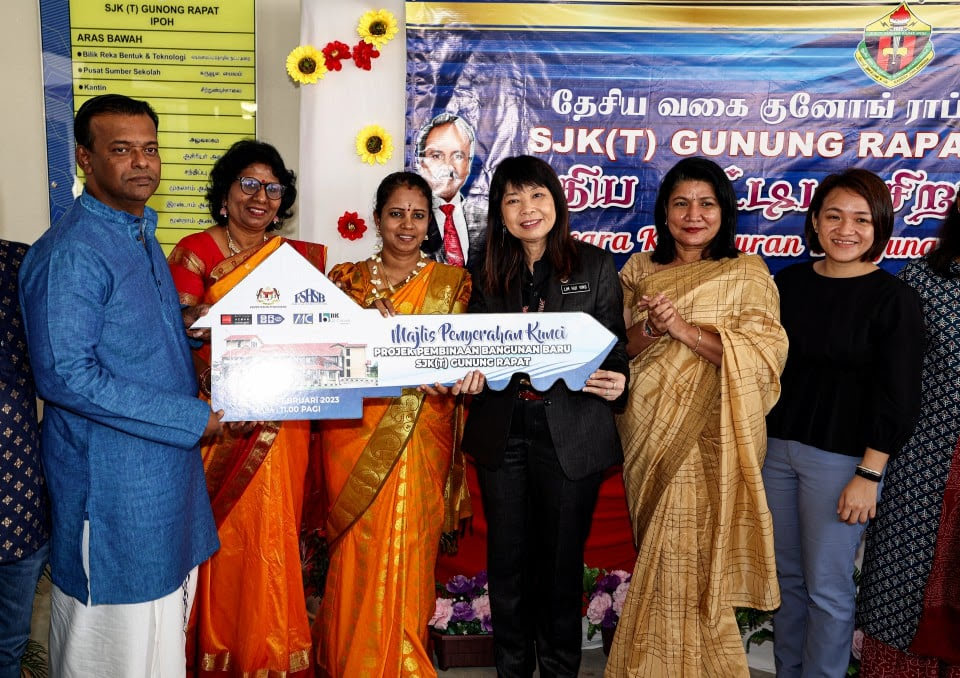 KPM teliti isu SJKT kurang murid di pedalaman Hui Ying (tiga, kanan) menyampaikan replika kunci kepada Guru Besar Sekolah Jenis Kebangsaan Tamil (SJKT) Gunung Rapat, S. Mariamal (dua, kiri) pada Majlis Penyerahan Kunci Projek Pembinaan Bangunan Baharu SJKT Gunung Rapat hari ini. Turut hadir, Timbalan Menteri Pembangunan Usahawan dan Koperasi Senator Saraswathy Kandasami (dua, kanan). - Foto BERNAMA