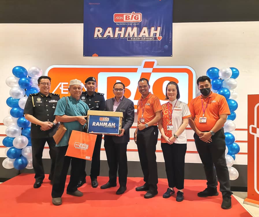 Pengarah KPDN Perak, Datuk Kamalludin Ismail menyampaikan Bakul Rahmah kepada penerima dari golongan kurang berkemampuan pada Majlis Pelancaran Jualan Rahmah di Aeon Big, Falim di sini pada Isnin.