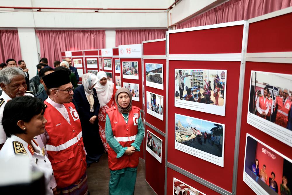 Perdana Menteri Datuk Seri Anwar Ibrahim (tiga, kiri) melawat galeri gambar sempena Sambutan Ulang Tahun Persatuan Bulan Sabit Merah Malaysia (PBSM) ke-75 dan Perasmian Ibu Pejabat PBSM di Jalan Wisma Putra hari ini.Kelihatan Pengerusi Bulan Sabit Merah Tan Sri Tunku Puteri Intan Safinaz Sultan Abdul Halim Mua'dzam Shah (kiri). - Foto BERNAMA
