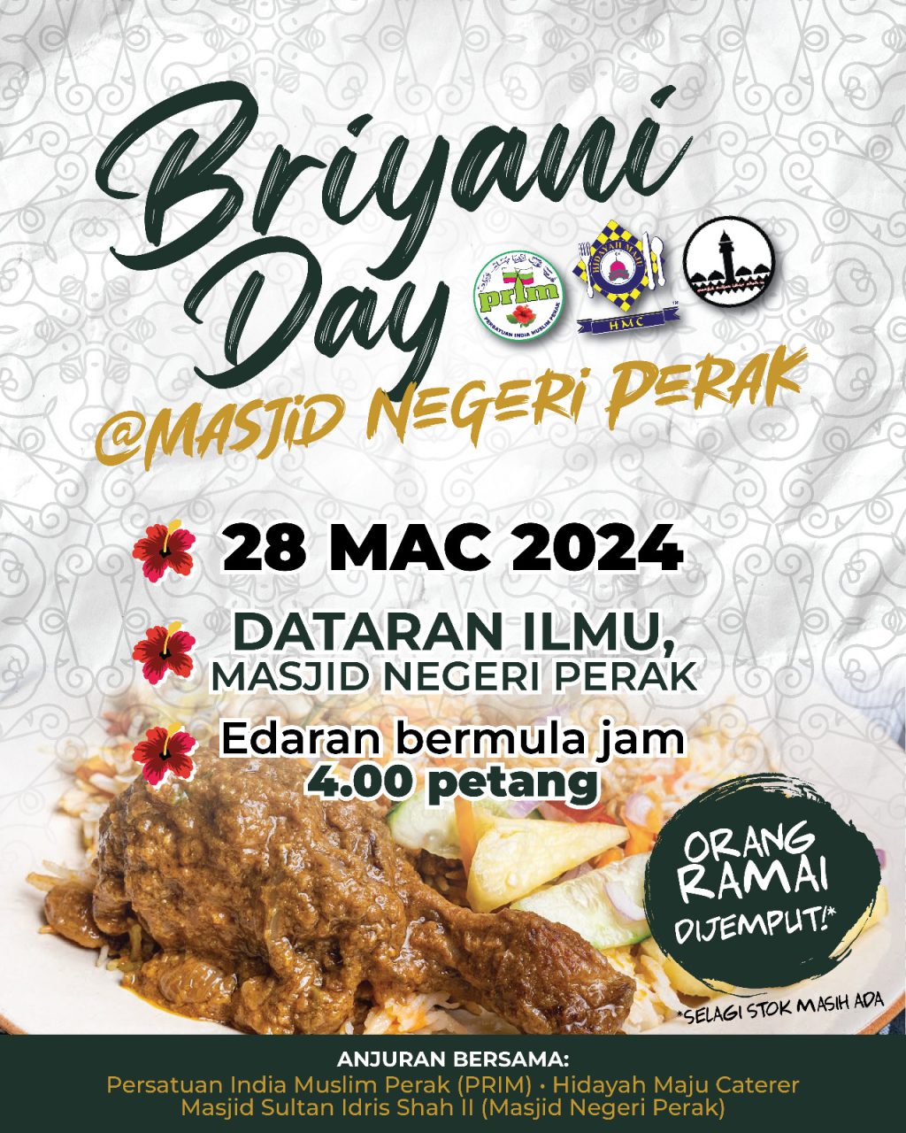 Briyani Day anjuran bersama Persatuan Indian Muslim Perak, Hidayah Maju Caterer Dan Masjid Sultan Idris Shah II (Masjid Negeri Perak).