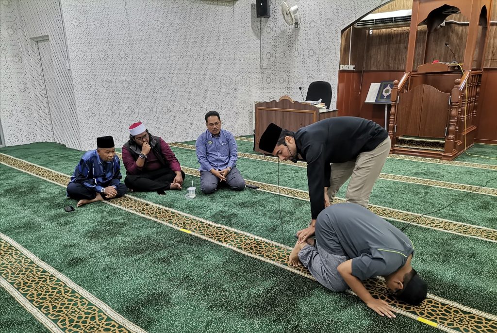 Mazlan (duduk kanan) ketika melihat cara tertib solat yang ditunjukkan kepada peserta pada program Jom Audit Solat di Masjid Hajjah Puteh Mahani, Bercham Raya, Ulu Kinta.