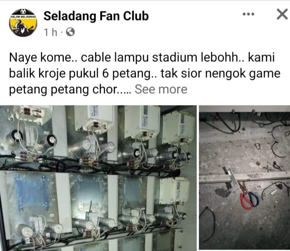 Gambar tular di media sosial berhubung kecurian kabel dan komponen lampu limpah di Stadium Perak. - Foto: Facebook Seladang Fan Club