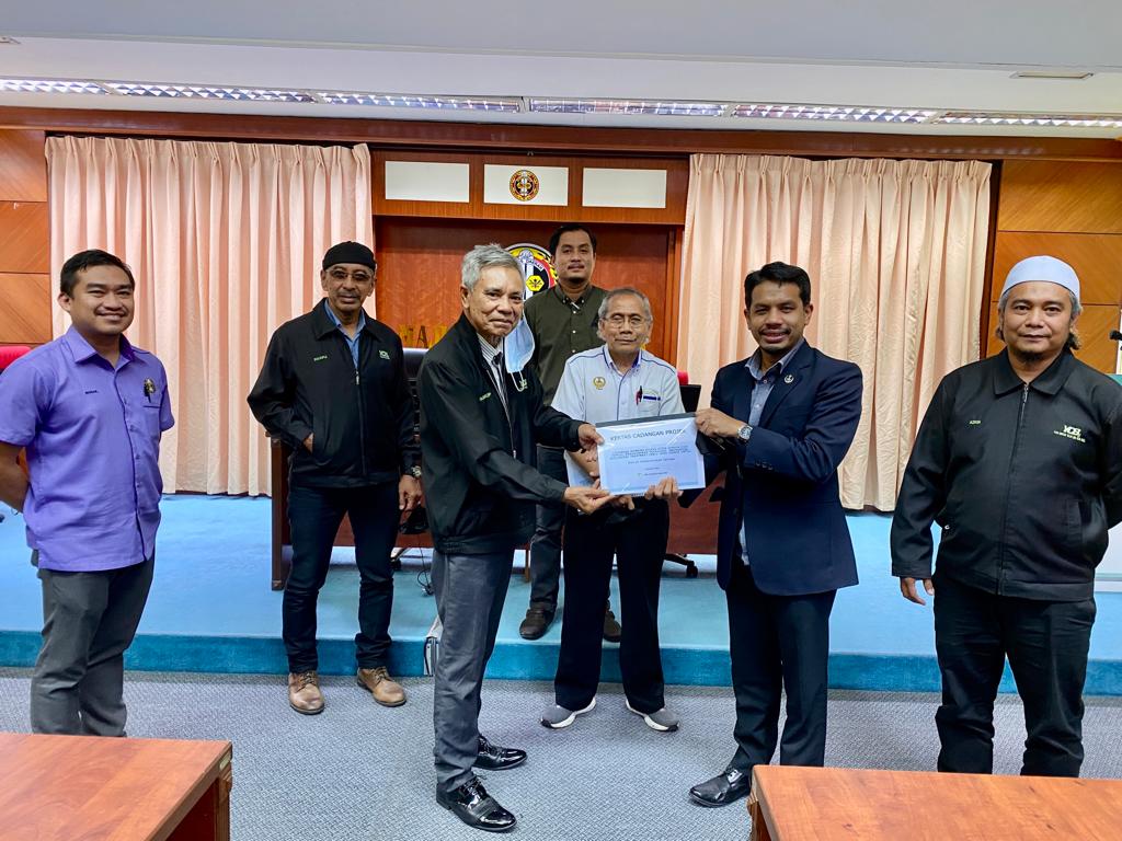 Pengerusi YCB Holding ( M) Sdn Bhd, Encik Yaakop Daut ( Kiri) menyerahkan Kertas Cadangan membina Kilang sisa pepejal bagi daerah Selama kepada Yang Dipertua Majlis Daerah Selama ( MDS), Encik Nor Akmal Yang Ghazali di bilik mesyuarat aras dua di MDS dengan disaksikan oleh Pengarah Komunikasi dan Korporat YCB Holding, Haji Amir Hashim Yot ( tengah) dan pegawai- pegawai kedua- dua belah pihak.