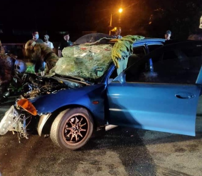 Keadaan kereta yang rosak teruk akibat kemalangan tersebut. - Foto: Bomba Teluk Intan.