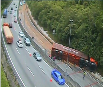 Keadaan lori sardin terbalik dalam insiden yang berlaku di Kilometer 265.9 Lebuhraya Utara Selatan (PLUS) arah selatan tengah hari tadi. Foto: LLM Trafik