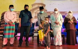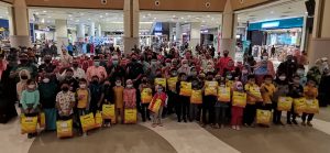 Datuk Bandar Ipoh, Datuk Rumaizi Baharin @ Md Daud menyampaikan sumbangan kepada anak-anak dari golongan B40 pada Majlis Penyampaian Pakaian Raya Ramadan Cheers anjuran Theta Edge Berhad dengan kerjasama MBI di Mydin Meru Raya, pada Jumaat.