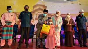 Penerima sumbangan bergambar kenangan bersama Datuk Bandar Ipoh, Datuk Rumaizi Baharin @ Md Daud selepas Majlis Penyampaian Pakaian Raya Ramadan Cheers anjuran Theta Edge Berhad dengan kerjasama MBI di Mydin Meru Raya, pada Jumaat.