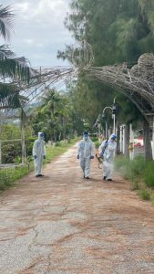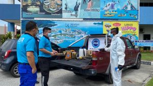 LUMUT : Dua hari berturut-turut 30 sukarelawan daripada Badan Bukan Kerajaan (NGO) Blue Sky Rescue turun padang bagi melakukan operasi sanitasi awam dan disifeksi seluruh pulau buatan tersebut.