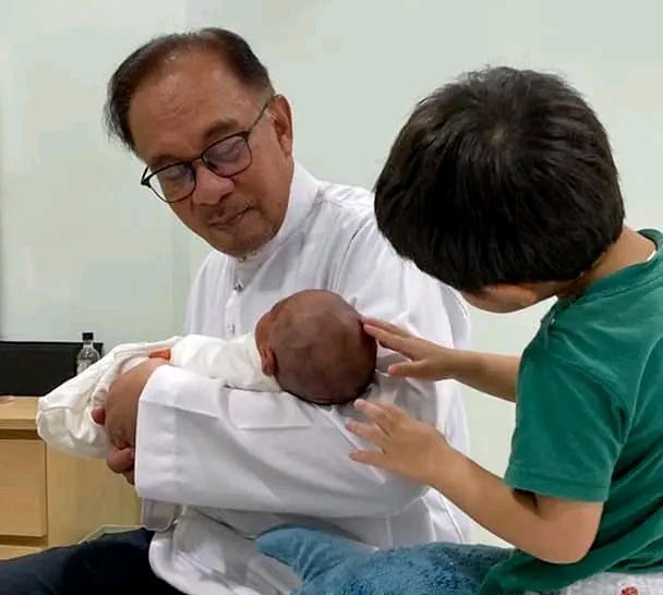Perdana Menteri Datuk Seri Anwar Ibrahim menimang seorang cucu perempuan, hari ini. - Foto Facebook Anwar Ibrahim