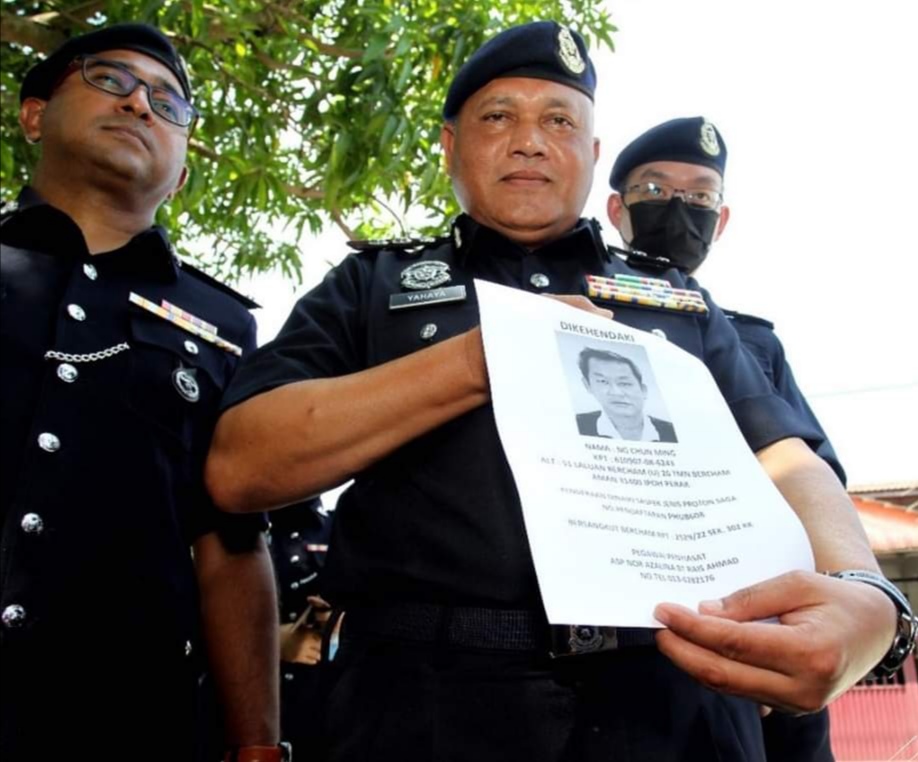 Ketua Polis Daerah Ipoh ACP Yahaya Hassan menunjukkan gambar suspek dikenali sebagai Ng Chun Ming, 61, iaitu adik kepada mangsa lelaki yang ditemukan maut bersama isterinya dipercayai dibunuh di Taman Bercham Aman, Ipoh pagi tadi. - Foto: BERNAMA.