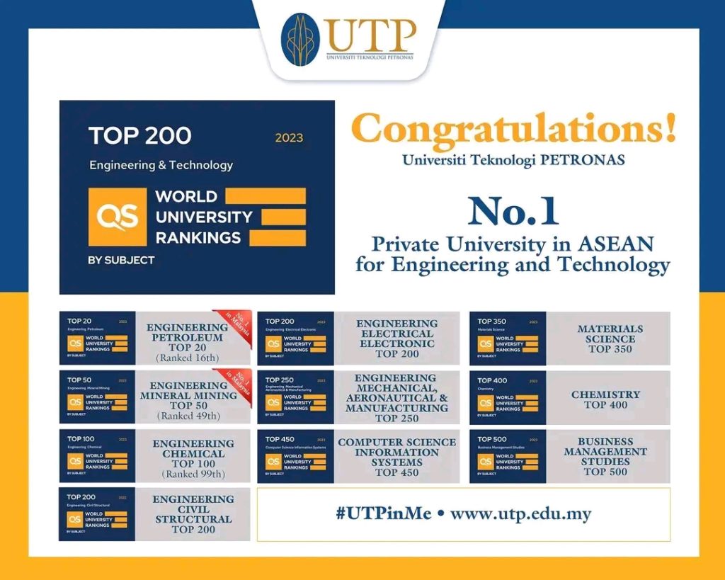 TAHNIAH diucapkan kepada Universiti Teknologi Petronas (UTP) kekal sebagai universiti swasta nombor satu ASEAN bagi bidang Kejuruteraan dan Teknologi.
